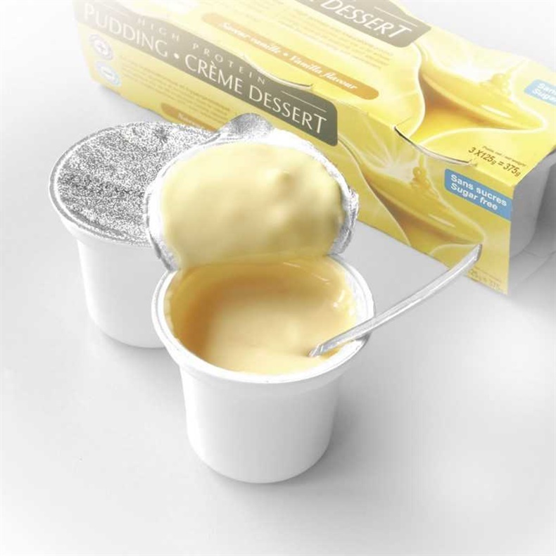 Hotový puding s příchutí vanilky s obsahem bílkovin a vlákniny, s nízkým obsahem cukru, se sladidly, která může být součástí diety k regulaci tělesné hmotnosti.