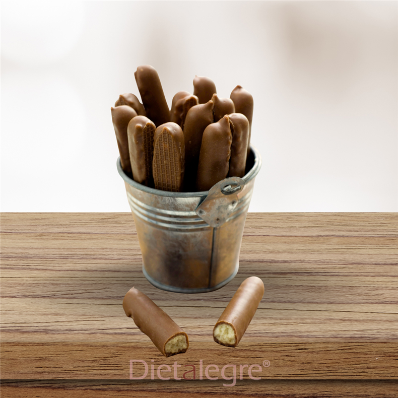 Sušenkový dezert s polevou z mléčné čokolády s vysokým obsahem bílkovin a vlákniny, s nízkým obsahem cukru, se sladidly, který může být součástí diety k regulaci tělesné hmotnosti.